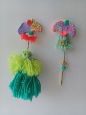 素材:ビーズ、紙粘土、アクリルガッシュ、フェイクファー、刺繍糸、毛糸、ピアス金具