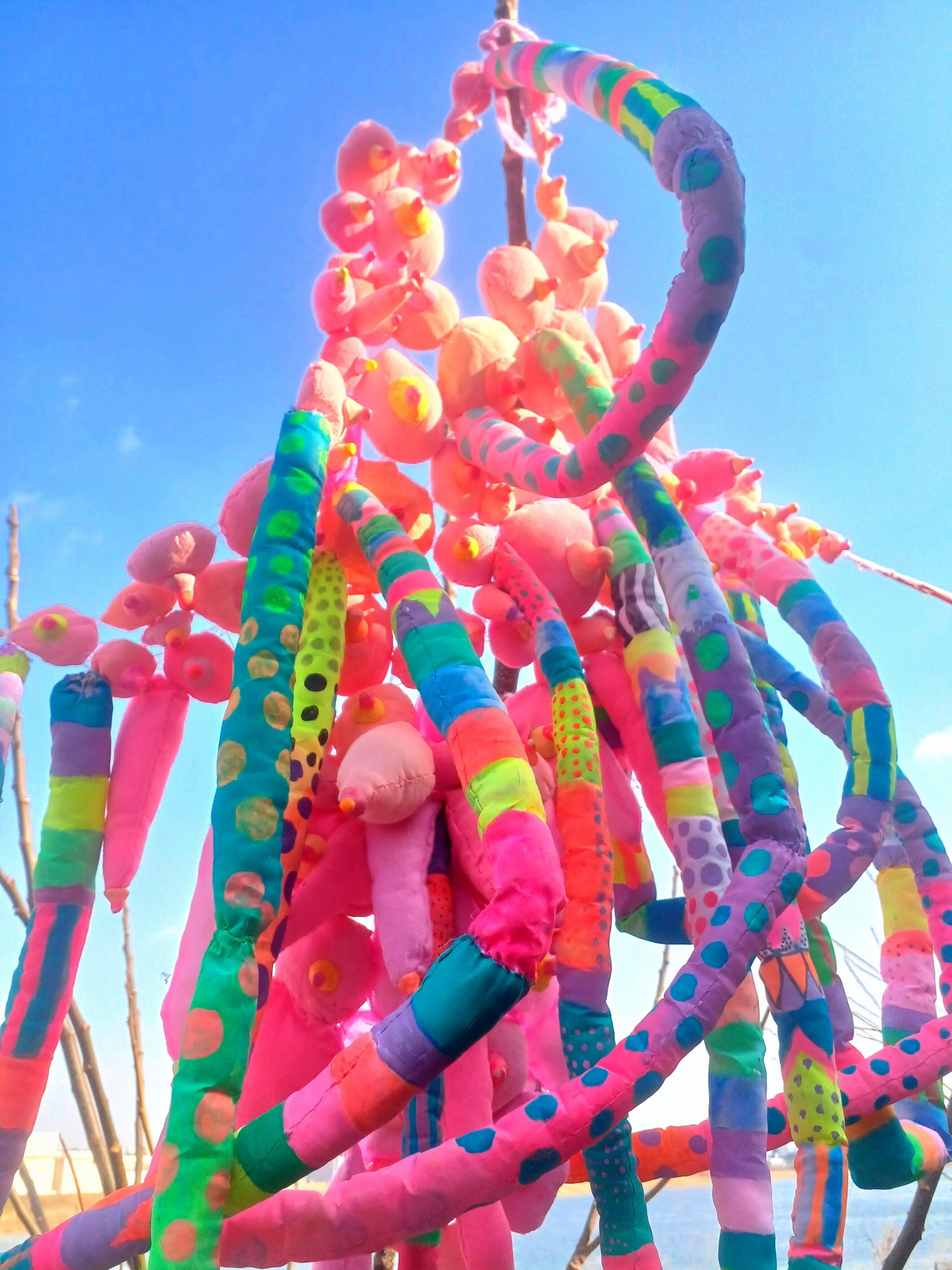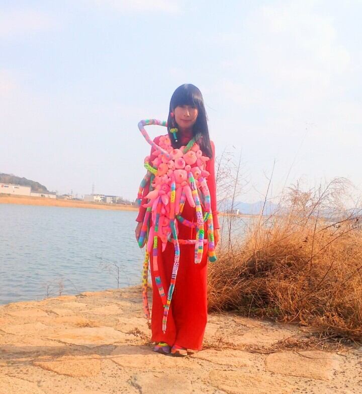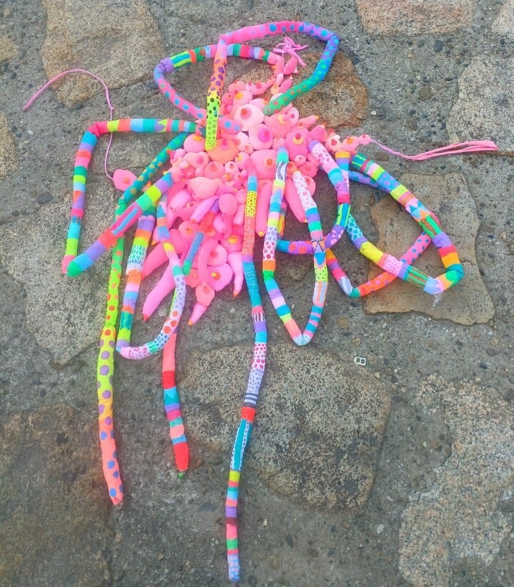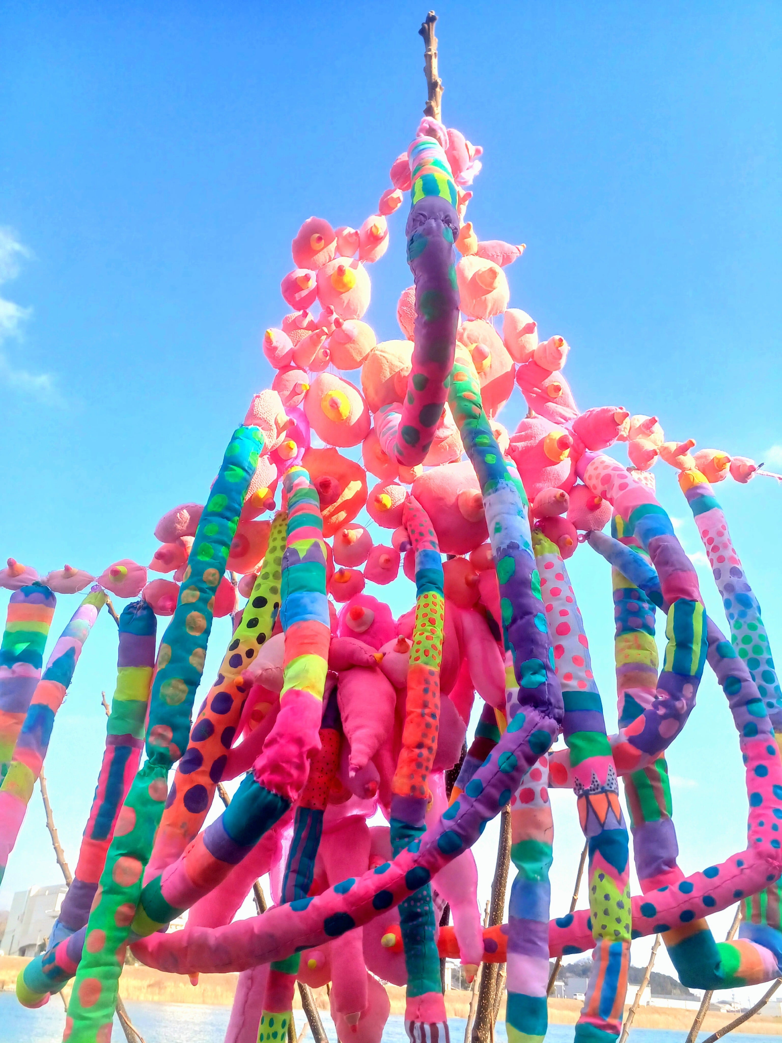 沢山のカラフルオッパイと腸で構成されたデザインで、着色はアクリル絵の具です。首紐の長さ(+腰紐も)は調整自由です。