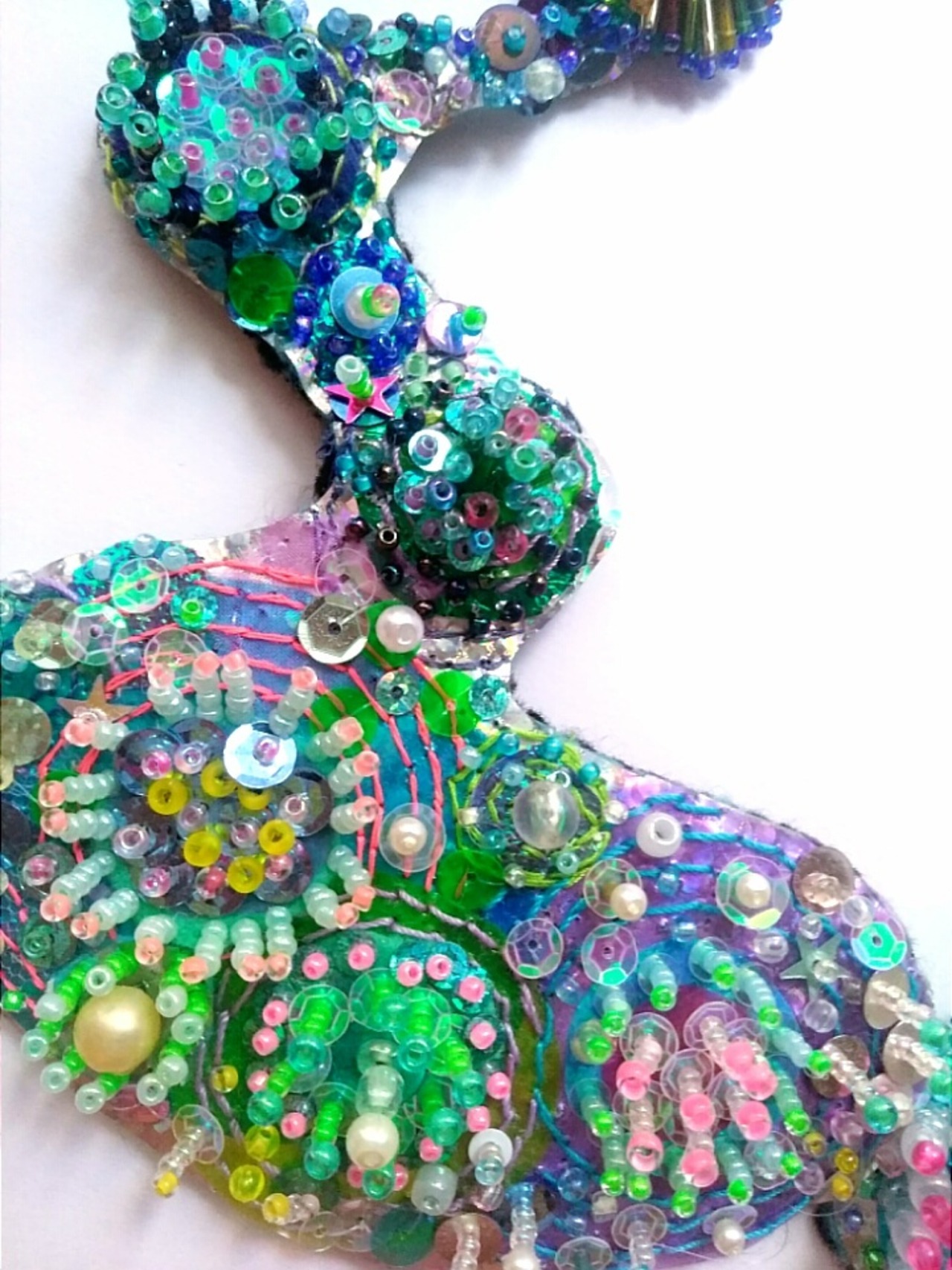 素材:ビーズ、スパンコール、刺繍糸、オーガンジー、ラメ紙、フェルト