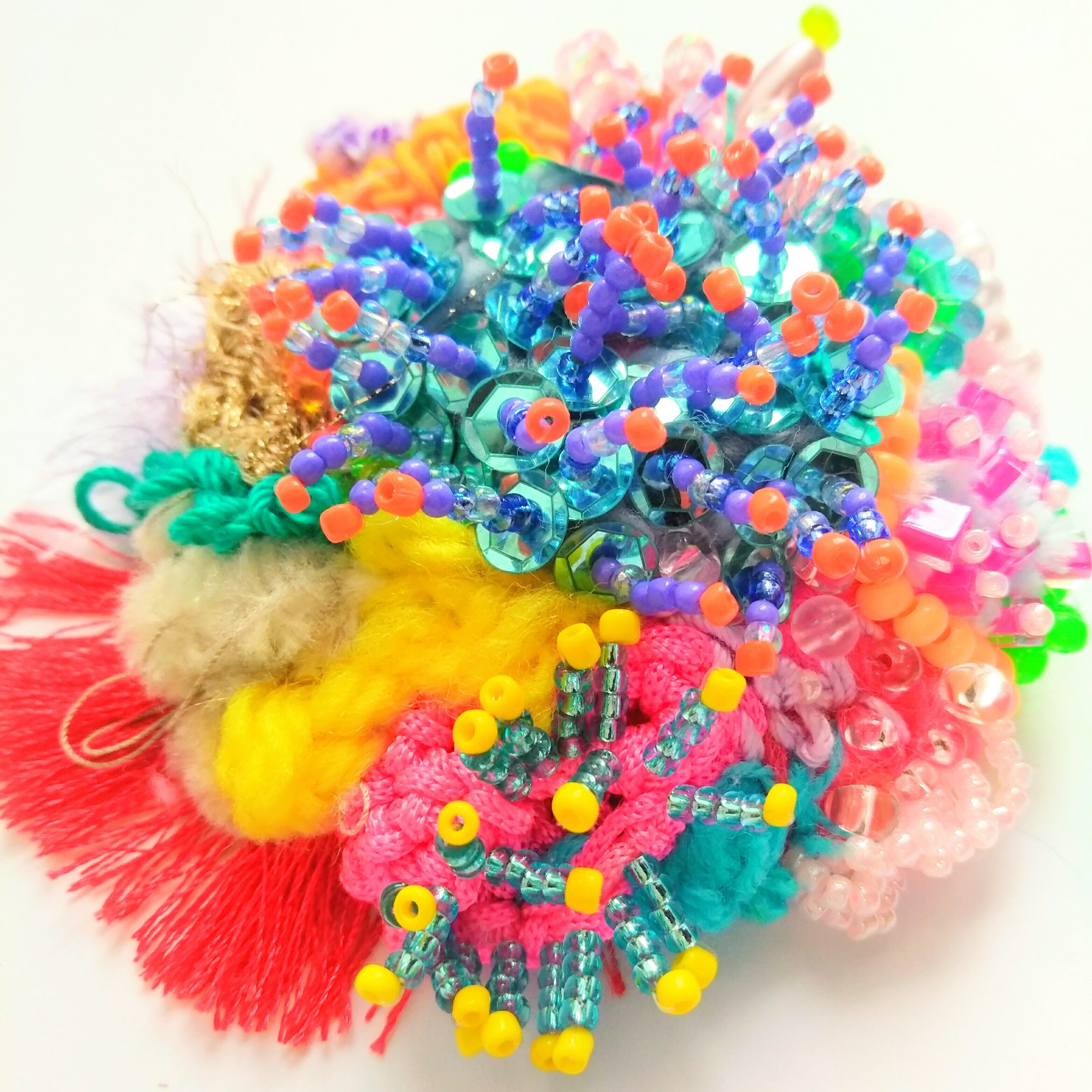 珊瑚礁をモチーフにした造形的なブローチです。ビーズワークや刺繍、ニッティング、ラッピング技法、テキスタイルアートを突き詰めたミヤケノリコ最新作シリーズです。細かい装飾と造形に反し、とても軽量なのでどんな服にも身に付けやすいブローチです。モノトーンコーデや冬のシックな装いにとてもマッチします。