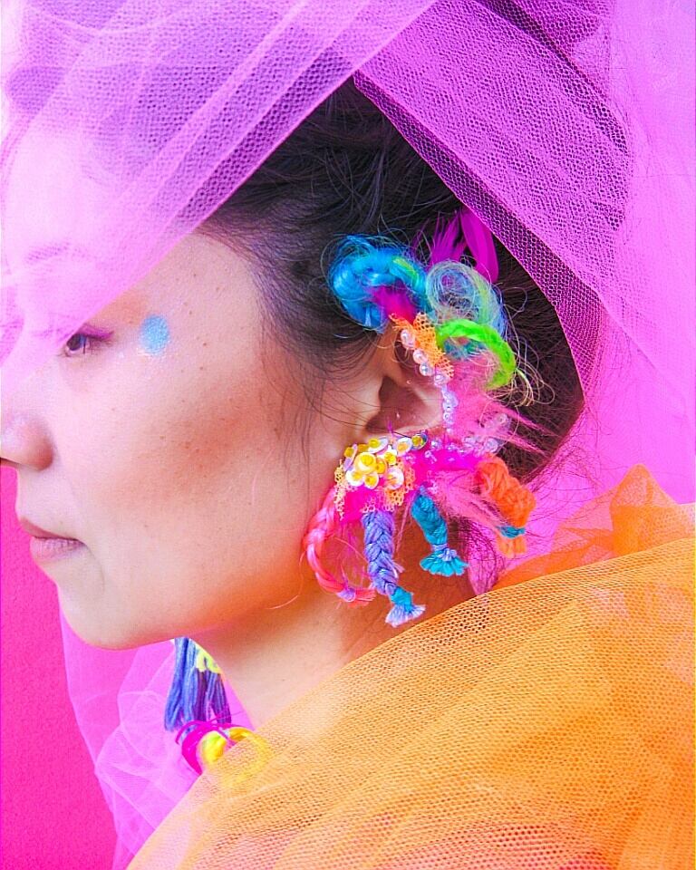 ビビッドカラーの三つ編みをCRAZY つけまに装飾した非対称デザインのイヤリングです。