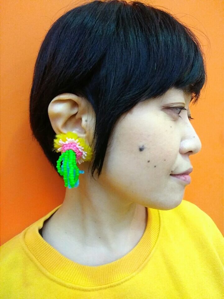左右非対称デザインのカラフルな珊瑚礁をイメージしたピアスです。両耳ともボリューミーなビーズワークでキラキラ煌めくスパンコールとビーズのグラデーションも可愛いです。