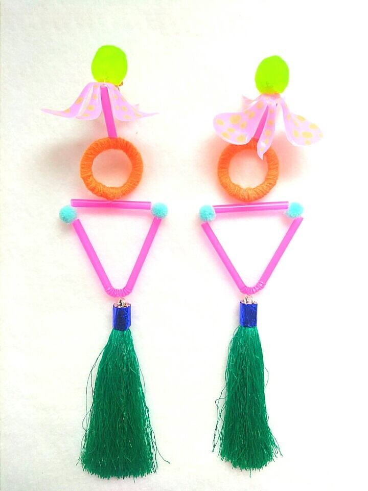 フラワーモチーフのカラフルなネックレスとピアスのセット。オモチャやストロー、ビーズや毛糸、多種な異素材を組み合わせて作った遊び心満載のアイテムです。舞台衣装のアイテムやパーティー衣装のアクセントにオススメです。