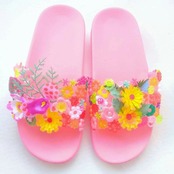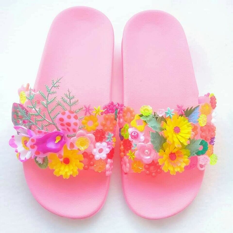 素材:サンダル、造花、ビーズ、ボタン、アクリル絵の具、マニキュア