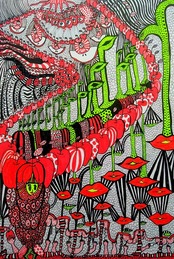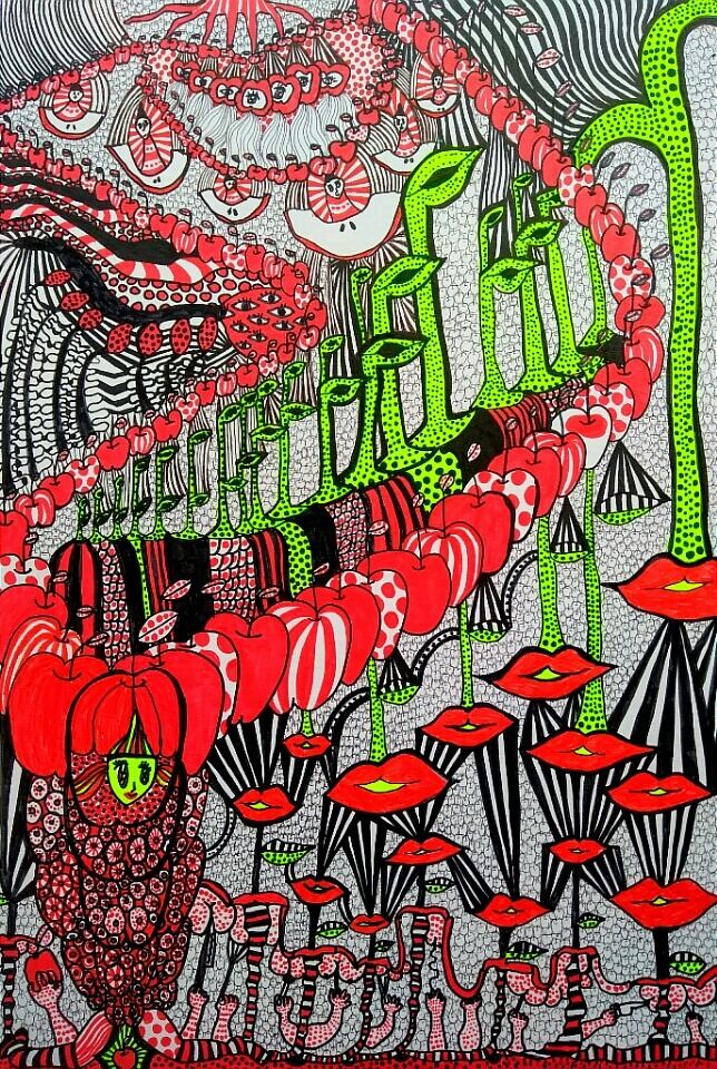 ボールペン、ポスターカラー、油性ペン、画用紙。