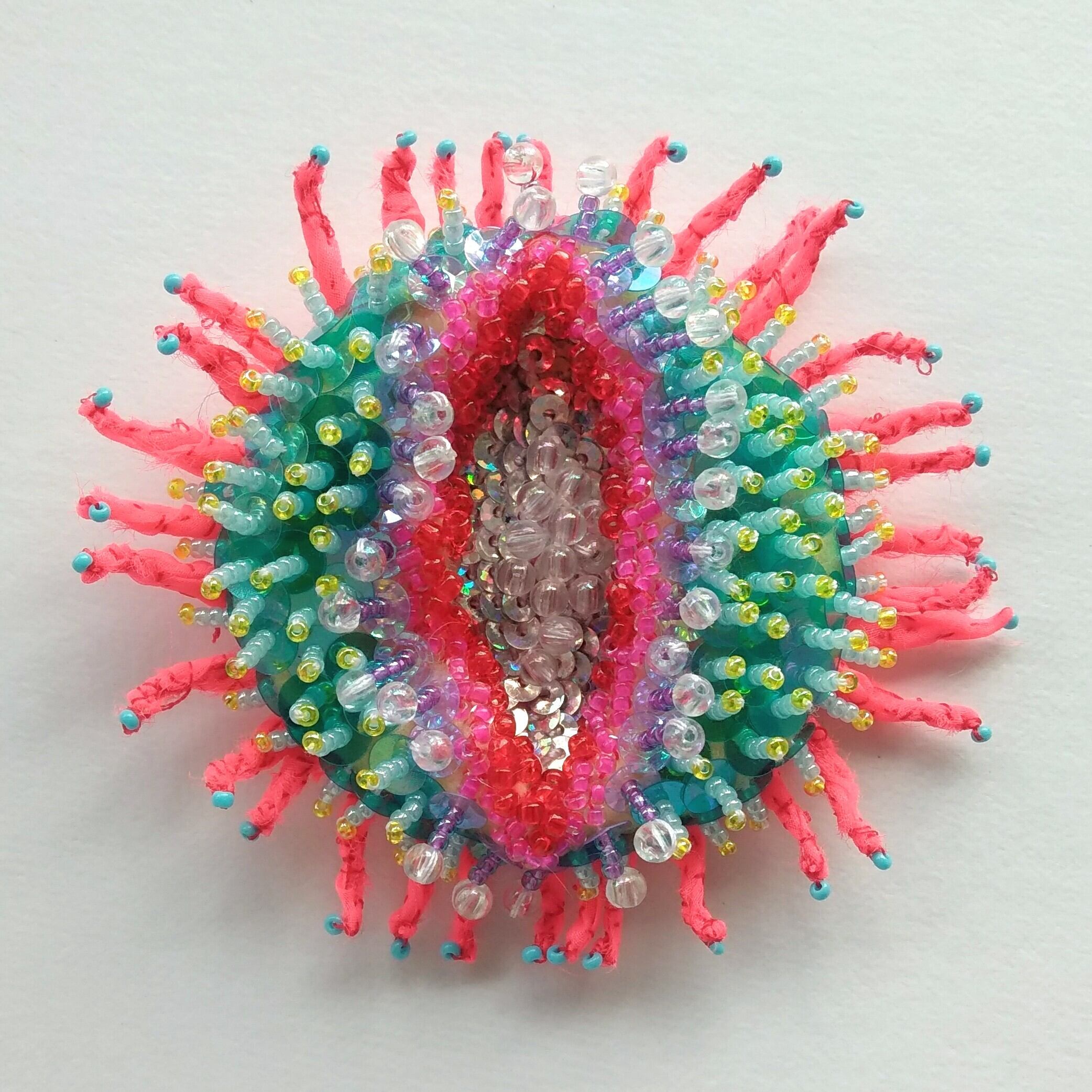 ビーズとスパンコールを一針一針、手作業で縫いあげた造形的なブローチです。