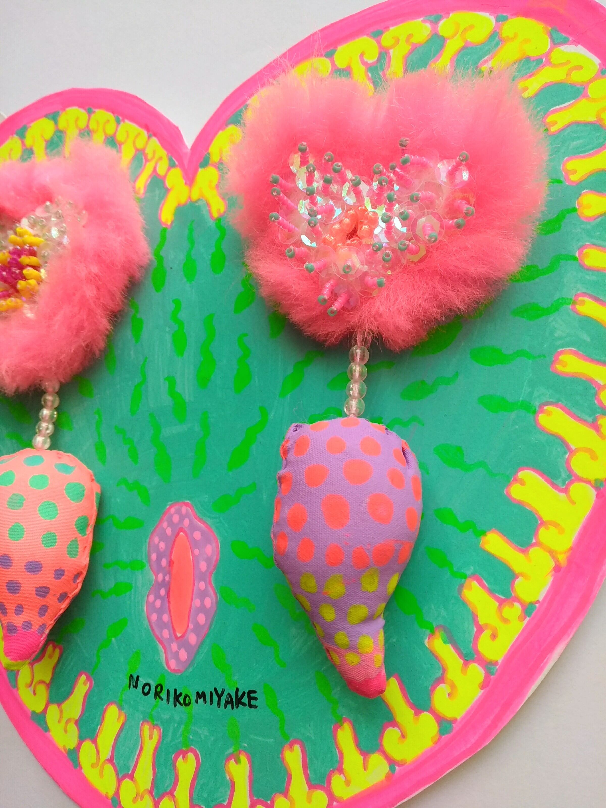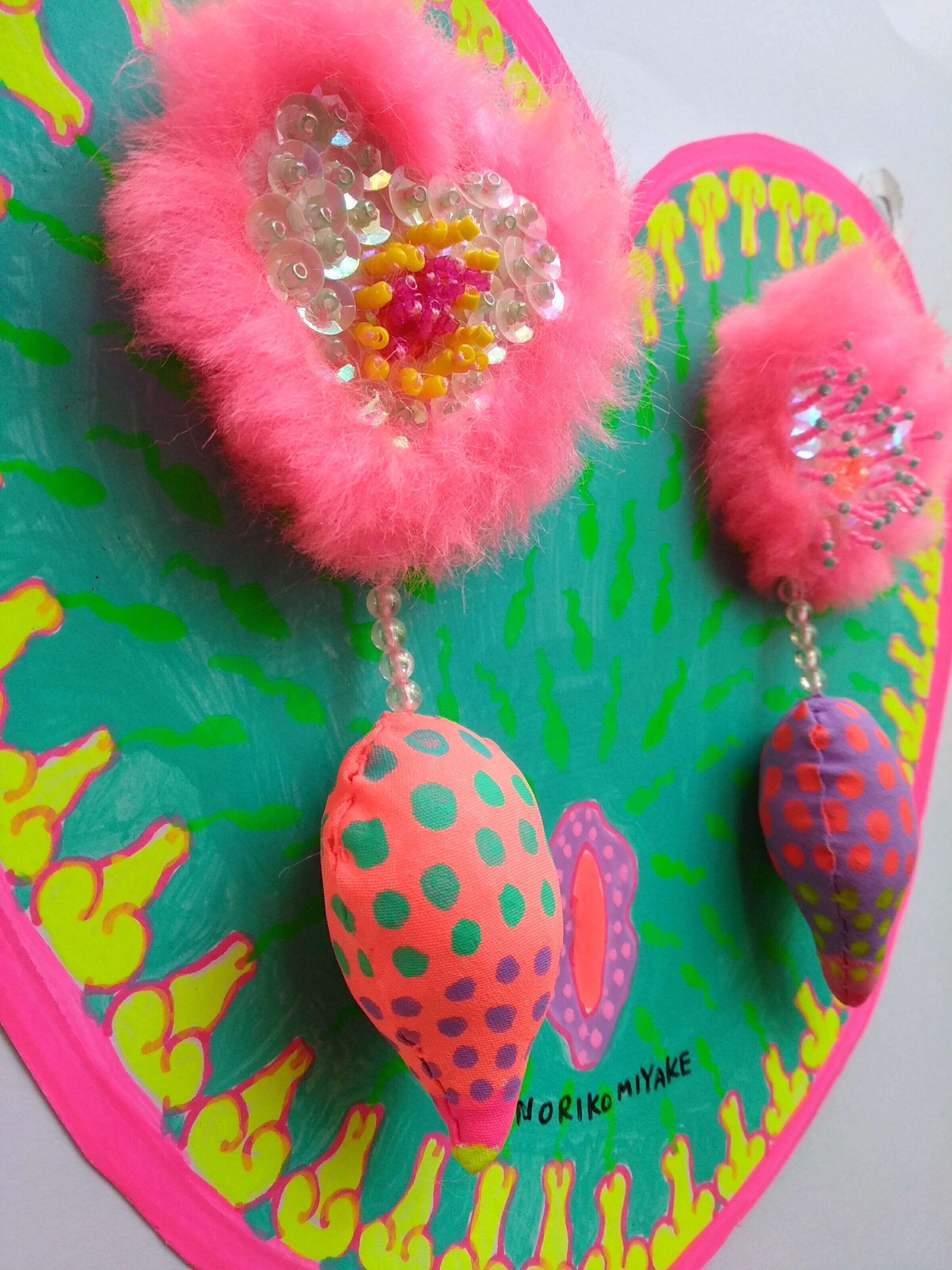 ビーズとスパンコール刺繍を施したキラキラハートに水玉チクビが組み合わさったピアスです。